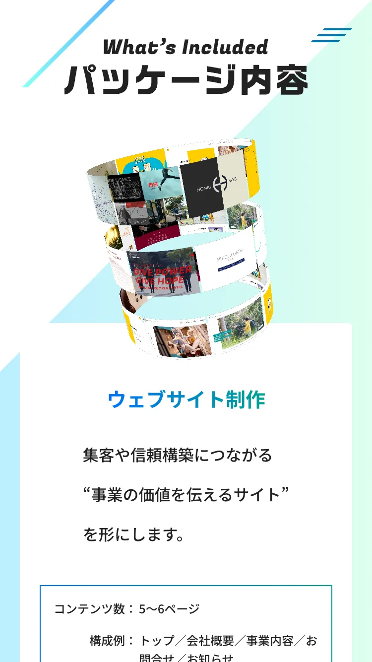 開業時に必要なホームページ・ロゴ・名刺を一括で制作するスタートアップ向けパッケージです。