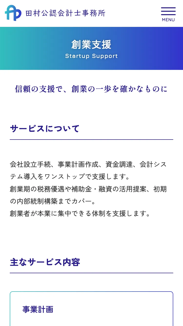 会計・税務の専門知識に加え、創業支援や資金計画など経営全体を見据えたサポートを提供されています。