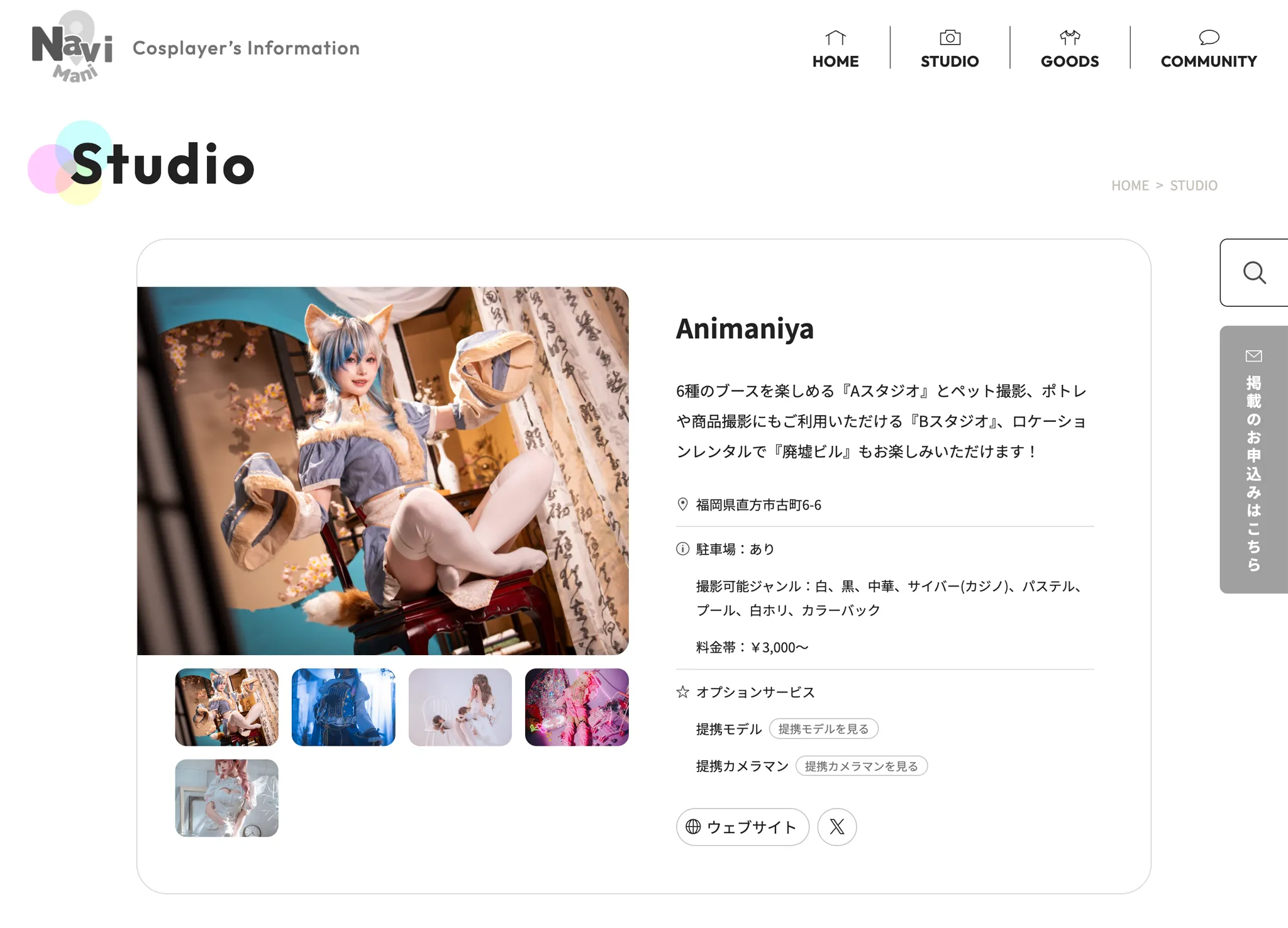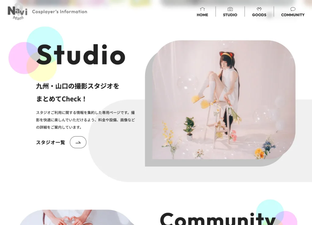 九州・山口エリアを中心に、コスプレ撮影に対応したスタジオ情報をまとめたポータルサイトです。撮影スタジオや関連通販の検索機能に加え、レイヤー・カメラマンが写真を投稿し、情報交換できるコミュニティ掲示板を実装。撮影場所探しから交流までを一つのサイトで完結できる設計とし、地域に根ざしたコスプレ活動をサポートしています。