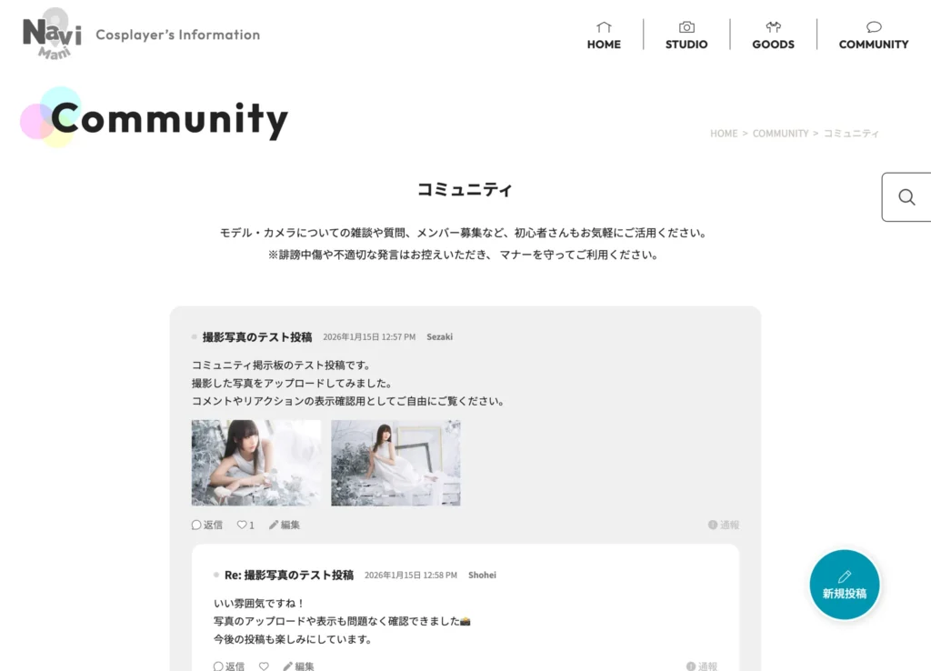 撮影スタジオや関連通販の検索機能に加え、レイヤー・カメラマンが写真を投稿し、情報交換できるコミュニティ掲示板を実装。